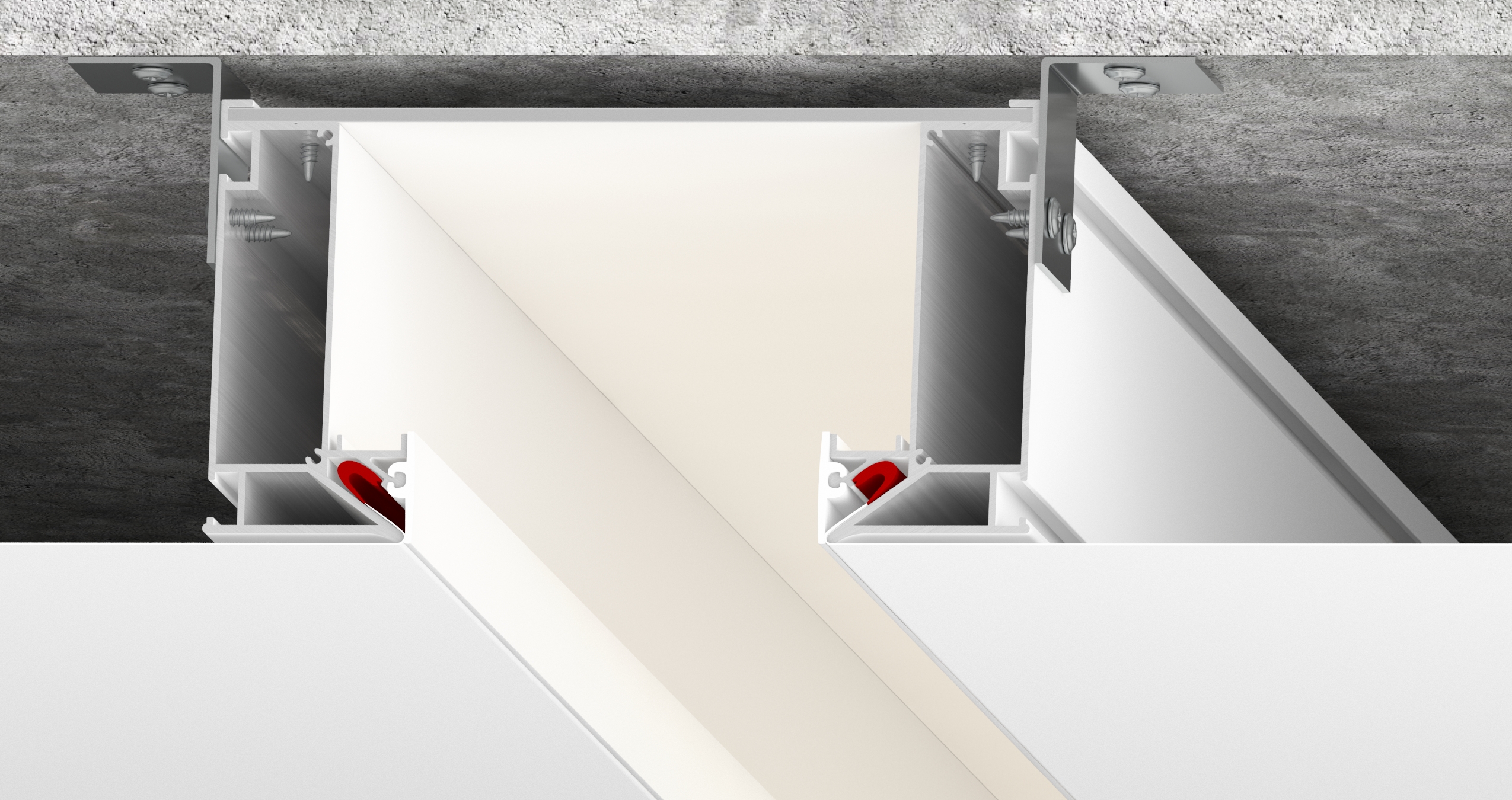 1. Ниша с рефлекторным освещением – это система освещения, которая в принципе своей работы использует отраженный свет. При изготовлении конструкции ниши применяются алюминиевые профили B01, расположенные симметрично друг к другу и композитные листы белого цвета. В специальные пазы с двух сторон профиля устанавливается светодиодная лента. Конструкция профиля предусматривает фиксацию полотна при помощи гарпунной системы крепления. Паз для фиксации гарпуна закрывается маскирующей вставкой, алюминиевой или ПВХ.