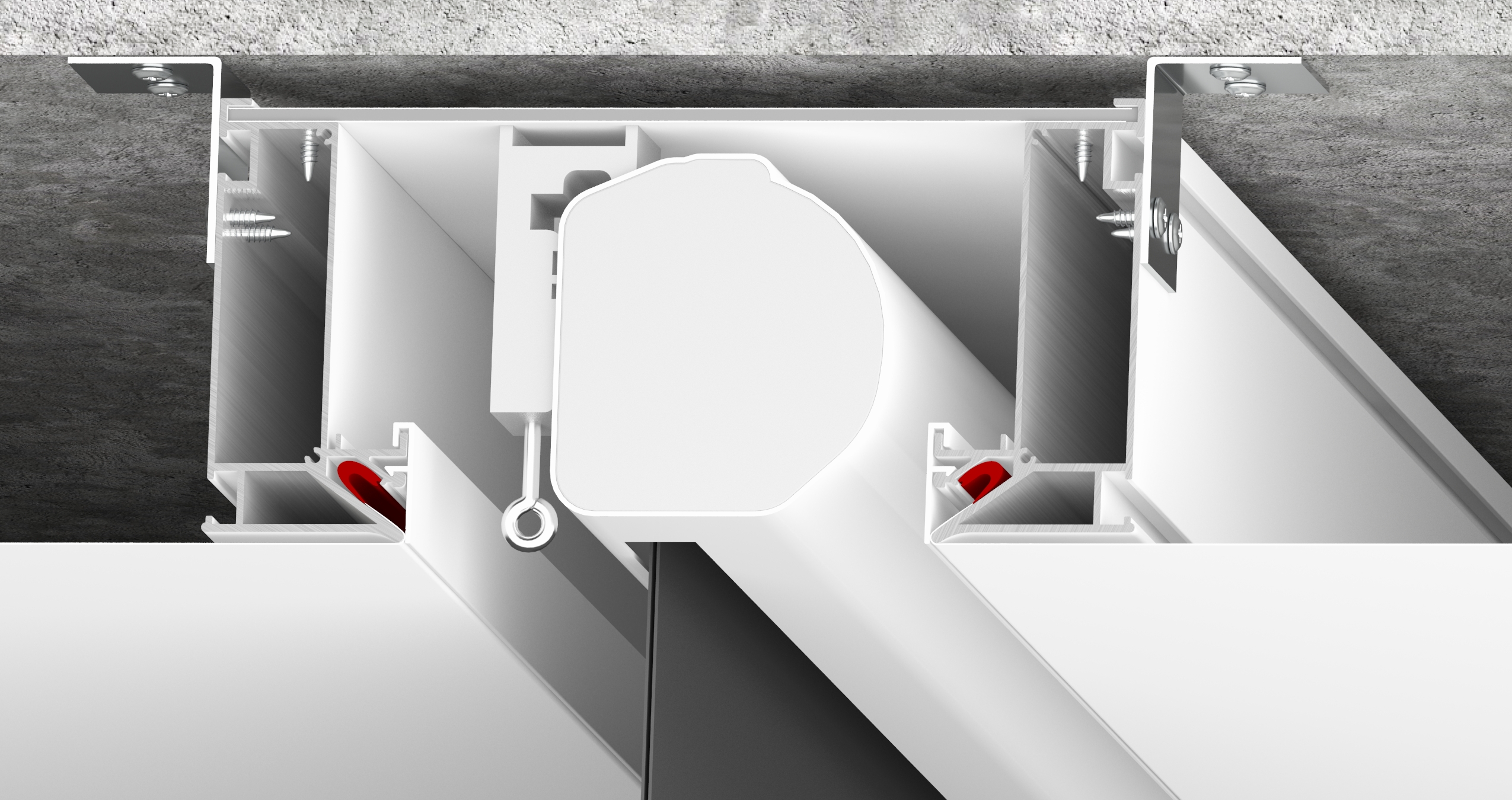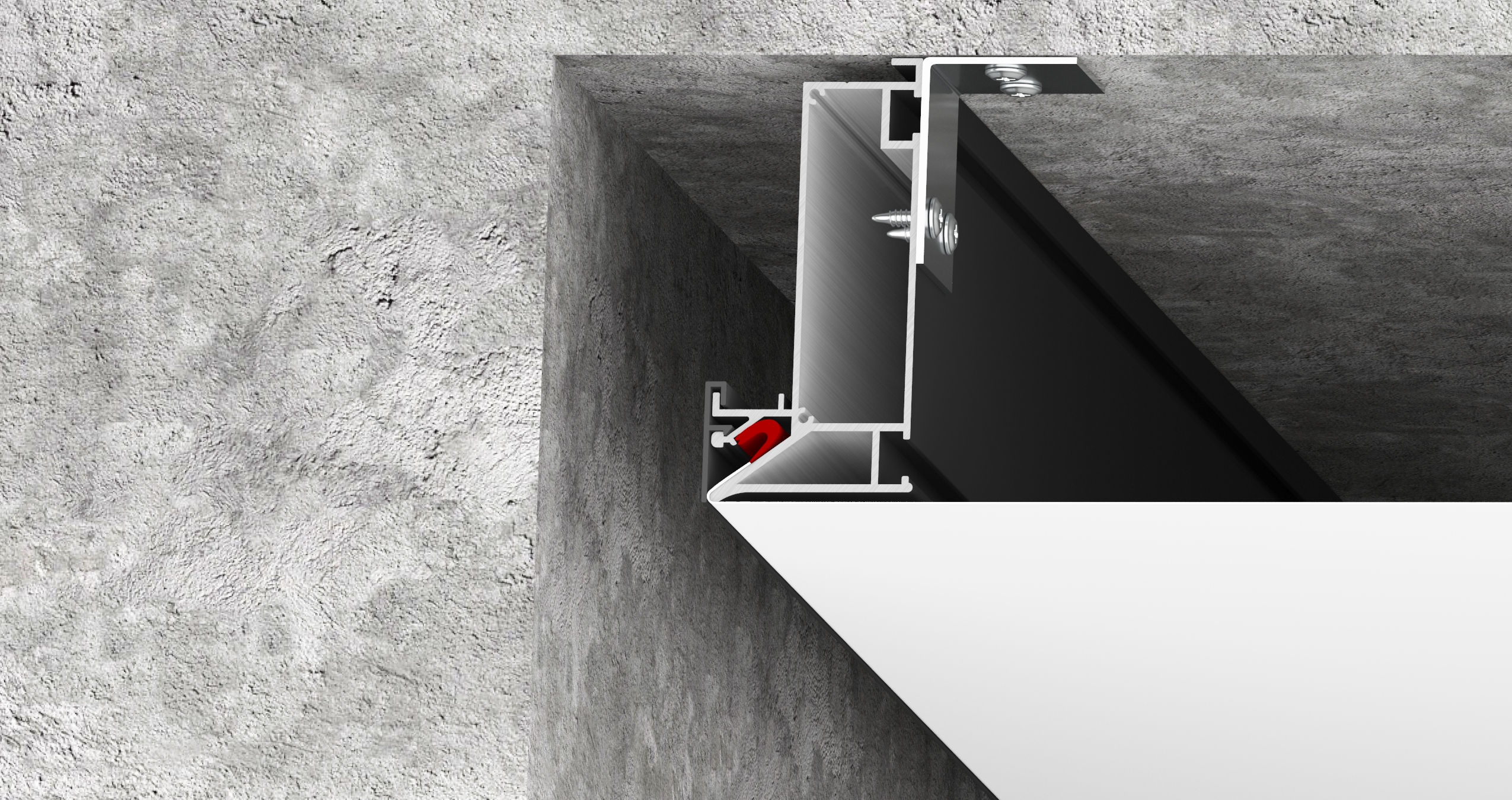 Применяется для организации скрытой ниши, с установкой механизмов электрокарниза или экрана проектора. Профиль крепится к потолку при помощи анкерных уголков.