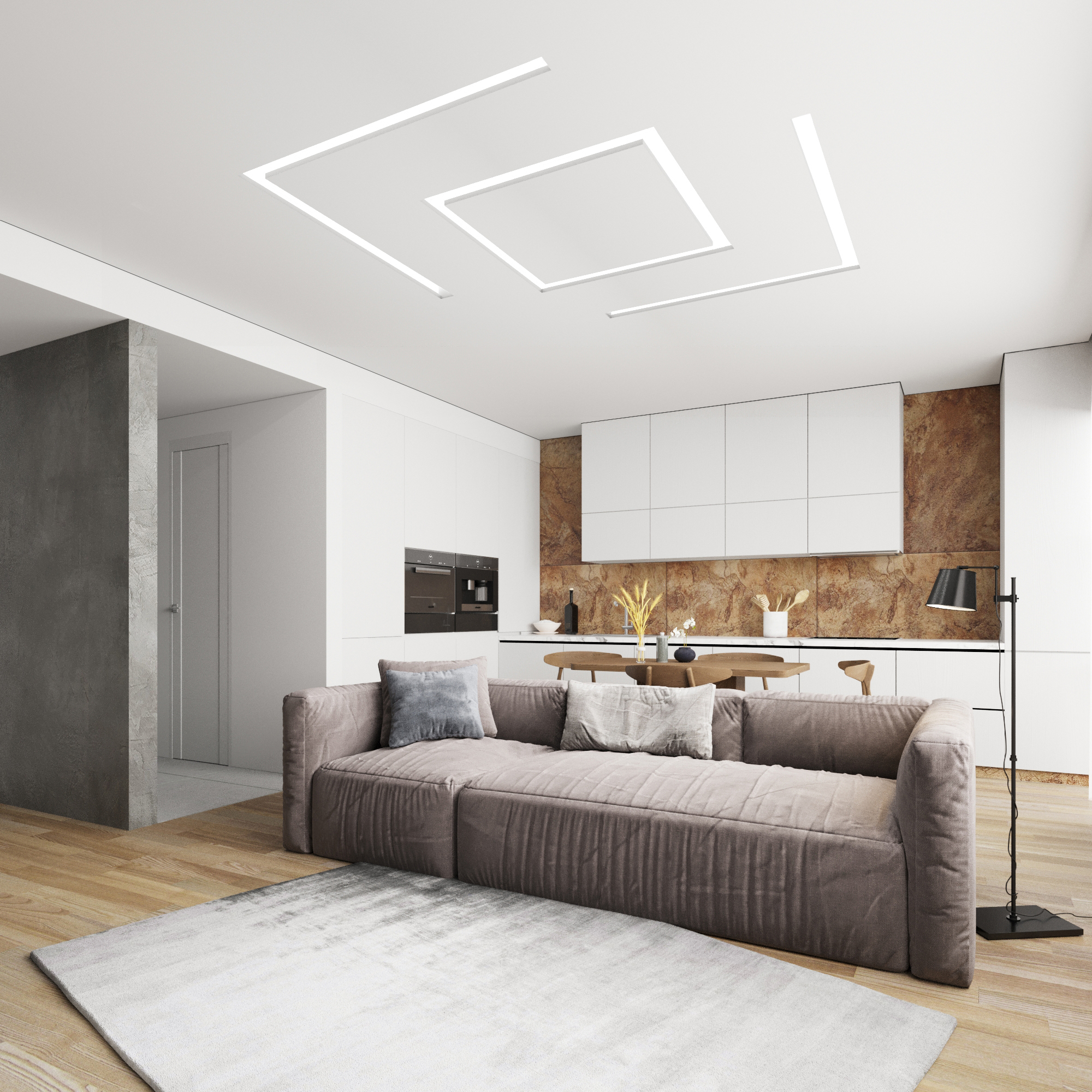 Устанавливается в помещении исходя из расчета 1 м/п конструкции на 3 — 4 м2 площади. Рекомендована установка светодиодной ленты с высокой яркостью по каждой стороне ниши. Профиль крепится к потолку при помощи анкерных уголков.