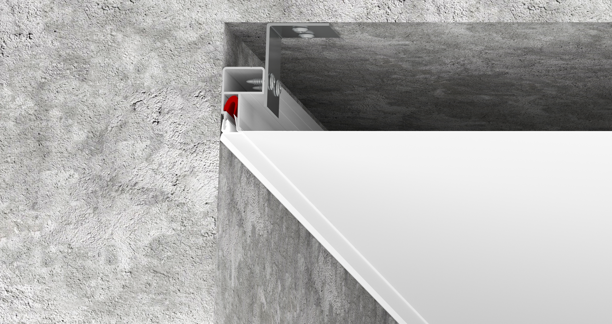 Брус универсальный используется для крепления натяжного потолка в тех местах, где крепление профиля к стене не рекомендуется или невозможно, таких как: стекло, зеркало, плитка керамогранитная, направляющая планка для дверей шкафа купе. Примыкание к стенам осуществляется с использованием технической вставки.