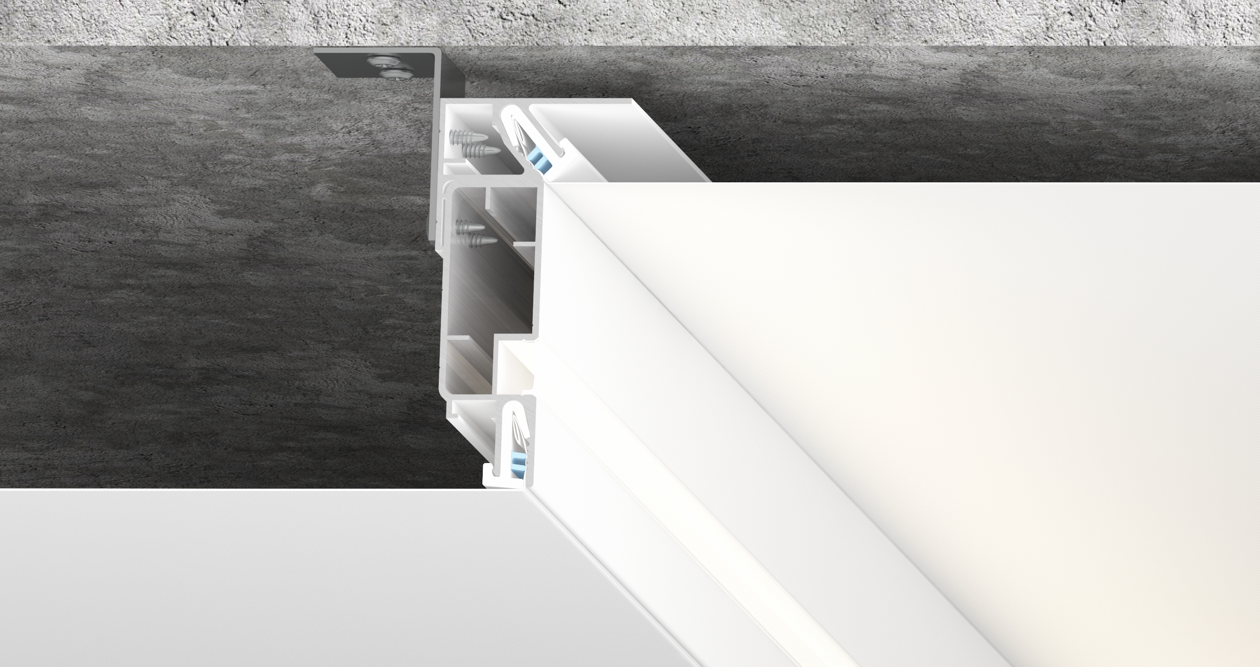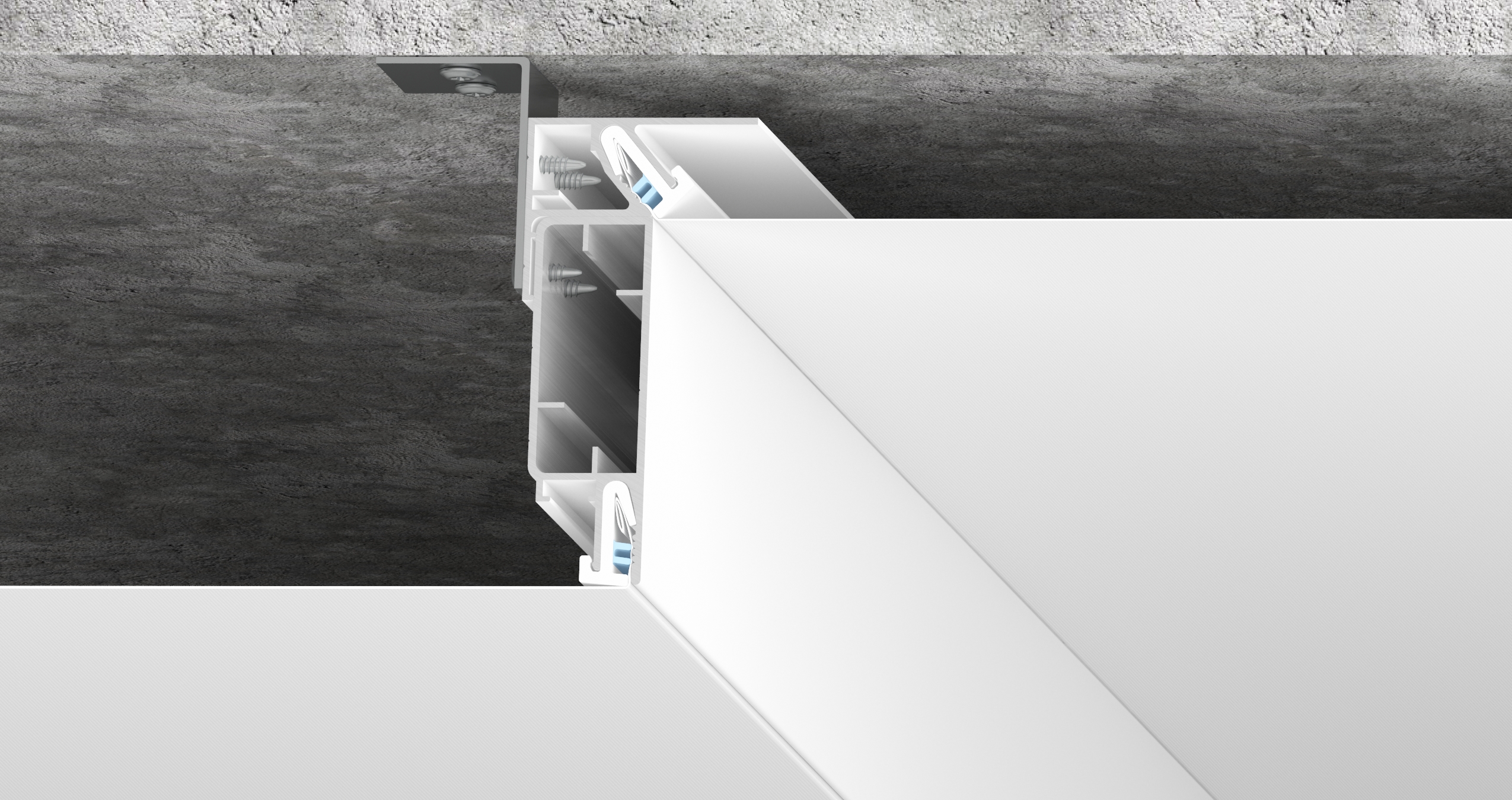 Профиль крепится к потолку при помощи анкерных уголков, далее к нему крепится профиль для перехода уровня, в зависимости от тех. задания (Level 50, Level 70, Level 90, Level LUX 70), рекомендуется для использования при монтаже двухуровневых без щелевых потолков из тканевых или ПВХ материалов.