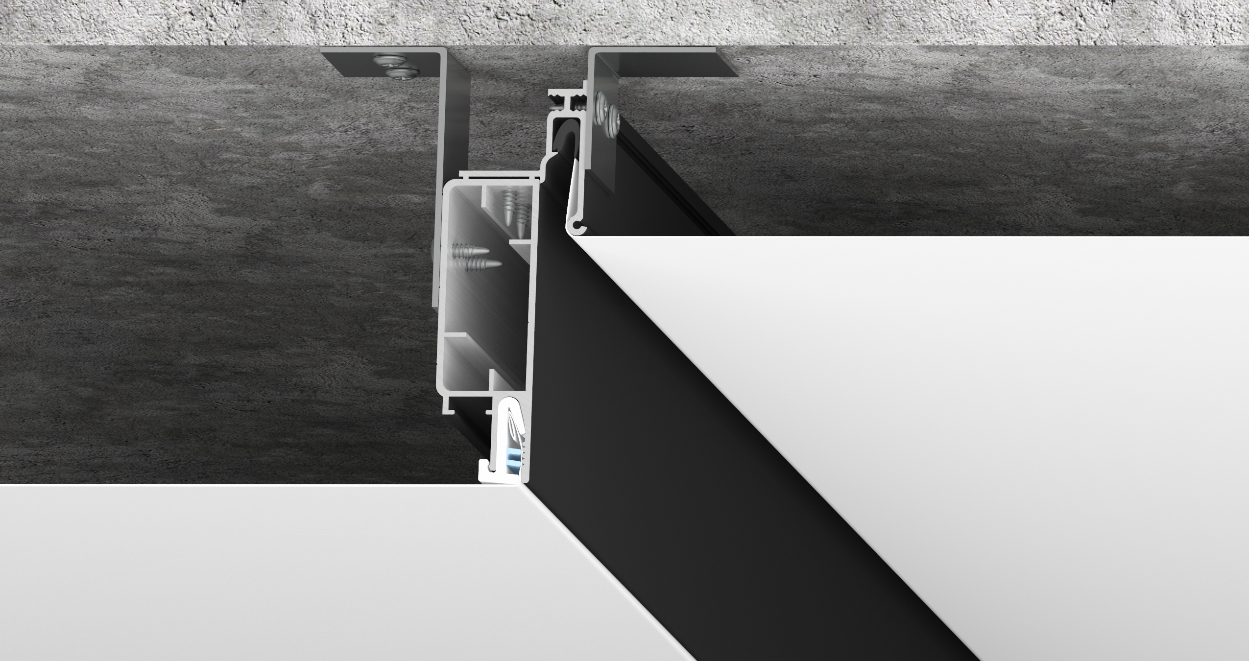 Профиль крепится к потолку при помощи анкерных уголков, далее к нему крепится профиль для перехода уровня, в зависимости от тех. задания (Level 50, Level 70, Level 90, Level LUX 70, PDK 60, PDK 80), рекомендуется для использования при монтаже двухуровневых потолков из ПВХ материалов с теневым зазором 6,5 мм между уровнями.