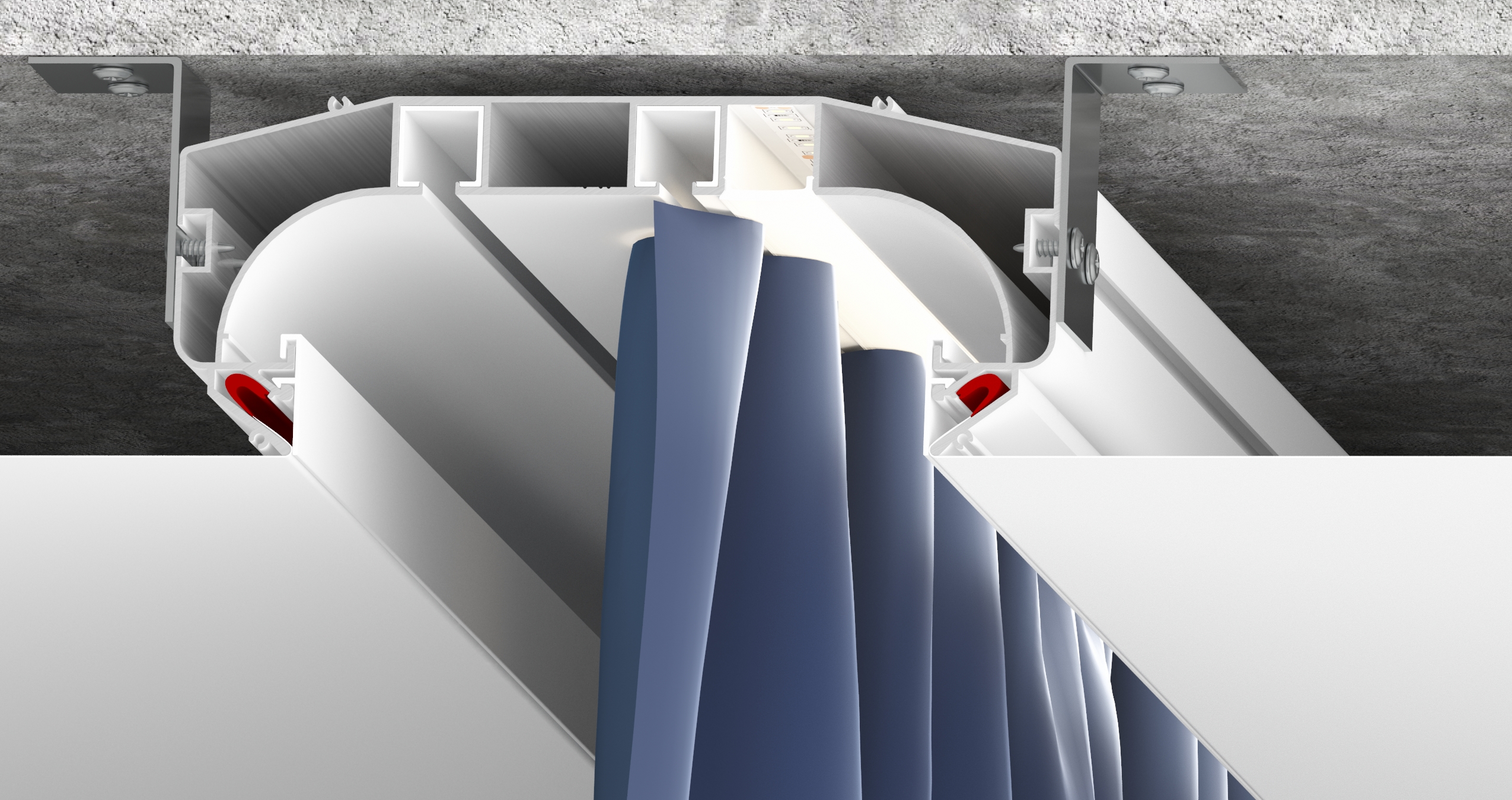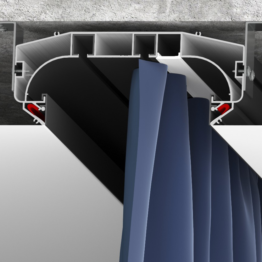 Разновидность дизайнерского карниза, представляет собой цельнометаллический профиль белого или черного цвета с двумя рядами для крепления крючков. Обладает увеличенным размером между рядами для крепления штор. Карниз имеет оптимальную ширину, для того чтобы складки на шторах формировались правильно. Возможна установка светодиодной ленты для подсветки штор. Конструкция профиля предусматривает фиксацию полотна при помощи гарпунной системы крепления. Паз для фиксации гарпуна закрывается маскирующей вставкой, алюминиевой или ПВХ. Оптимальное решение для оформления оконного пространства в любом помещении.
