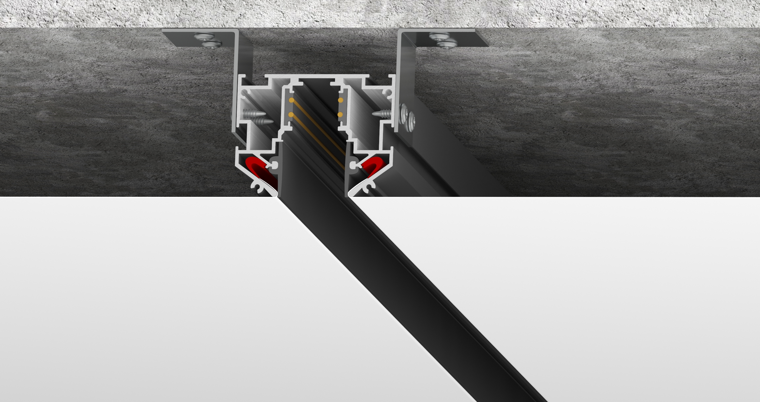 Конструкция профиля предусматривает фиксацию полотна при помощи гарпунной системы крепления. Таким образом Track 23 монтируется и располагается на одном уровне с натяжным потолком.